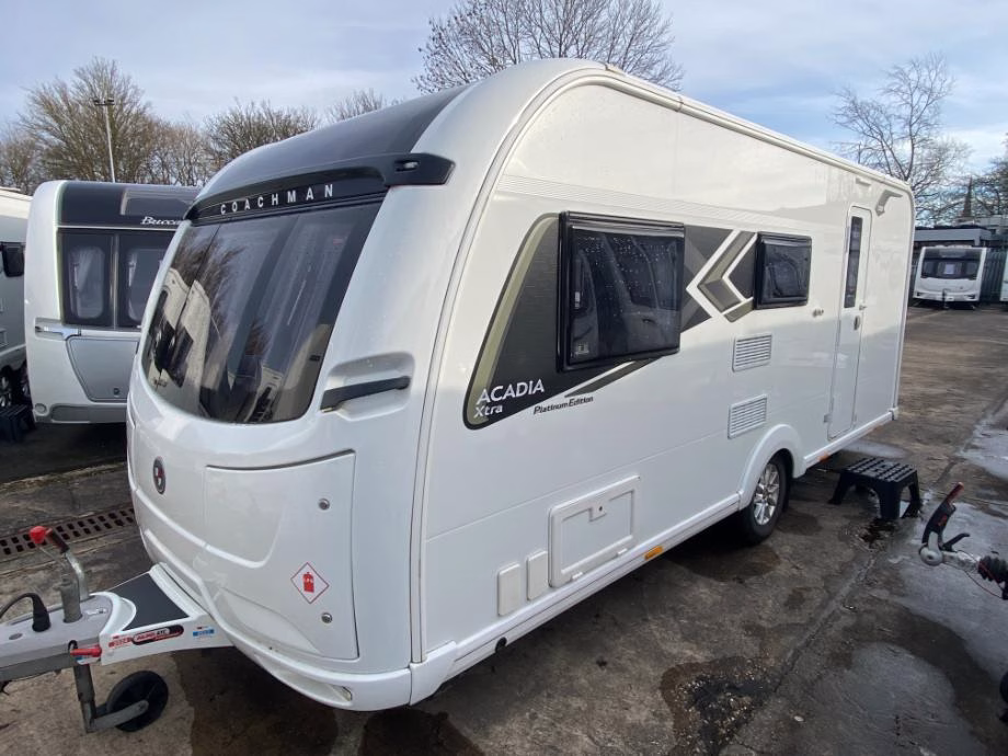 A premium 2021 Coachman Acadia Xtra 520 Platinum Edition offering a practical three-berth layout with side dinette and end washroom. Features include Alde heating, solar panel, alloy wheels, alarm, BBQ point and a 2-year warranty. Compact, comfortable and built for year-round touring.
