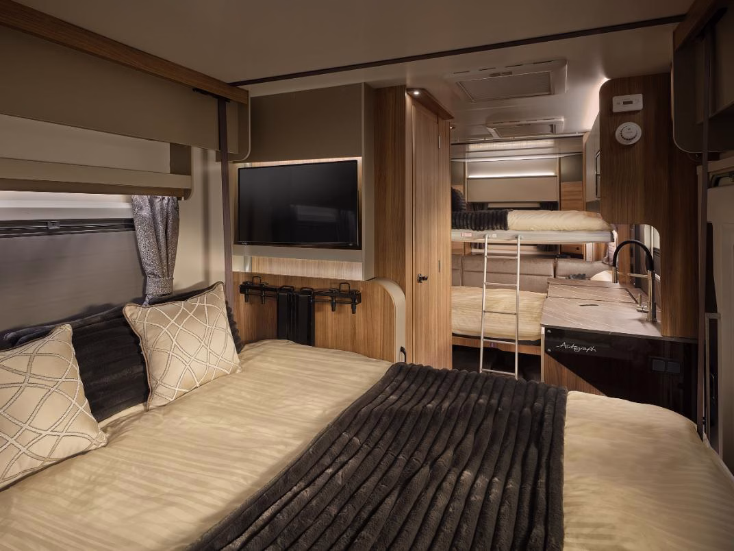 Features include a 10” HD touchscreen with Apple CarPlay/Android Auto, reversing camera, microwave, dual-fuel hob, solar panel, and a heated rear garage with 230V and 12V sockets. At 8.13m long with a 913kg payload, the Autograph 81-5 blends luxury with practicality, making it perfect for extended adventures or relaxing weekends away.