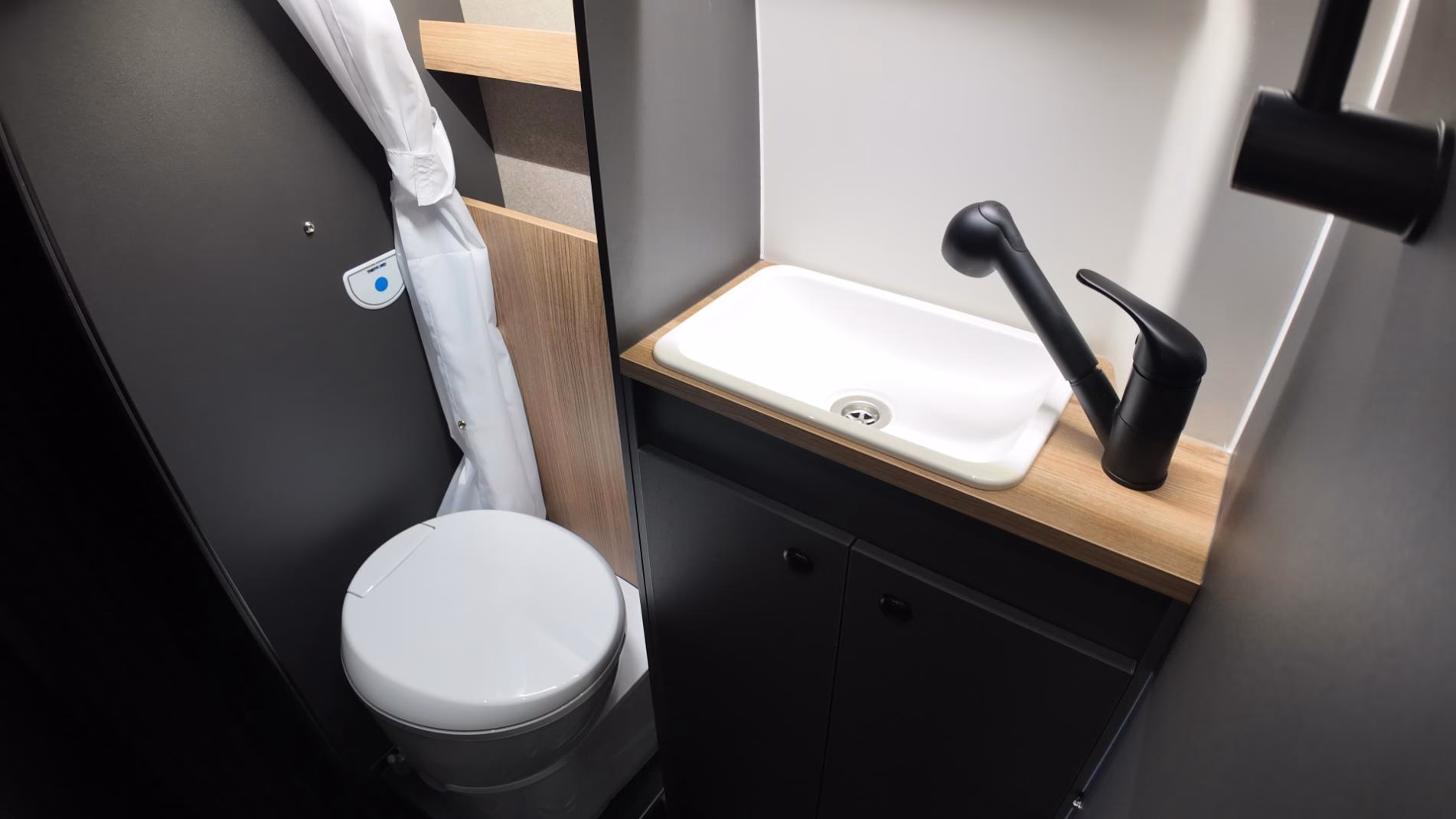 The kitchen gives you what you need for real touring. There’s a 90-litre compressor fridge that performs well off grid, a two-ring gas hob, sink and sensible storage. Opposite, the compact washroom includes a proper onboard shower and electric flush toilet. It’s designed to be usable rather than decorative.