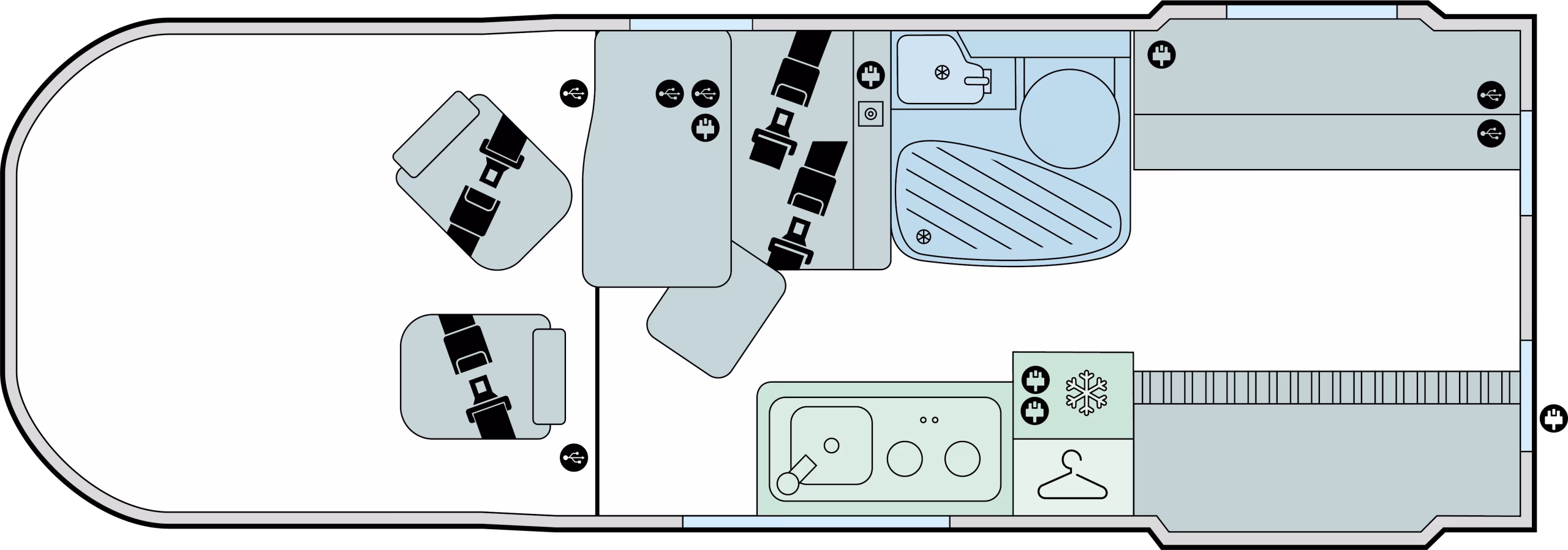 The kitchen is fully equipped for life on the road, with a Thetford 90-litre compressor fridge, 2-ring gas hob, sink with fold-down tap and practical storage throughout. Opposite, the space-saving washroom features an onboard shower, electric flush toilet and a clever tambour partition, giving you everything you need without wasting space.
