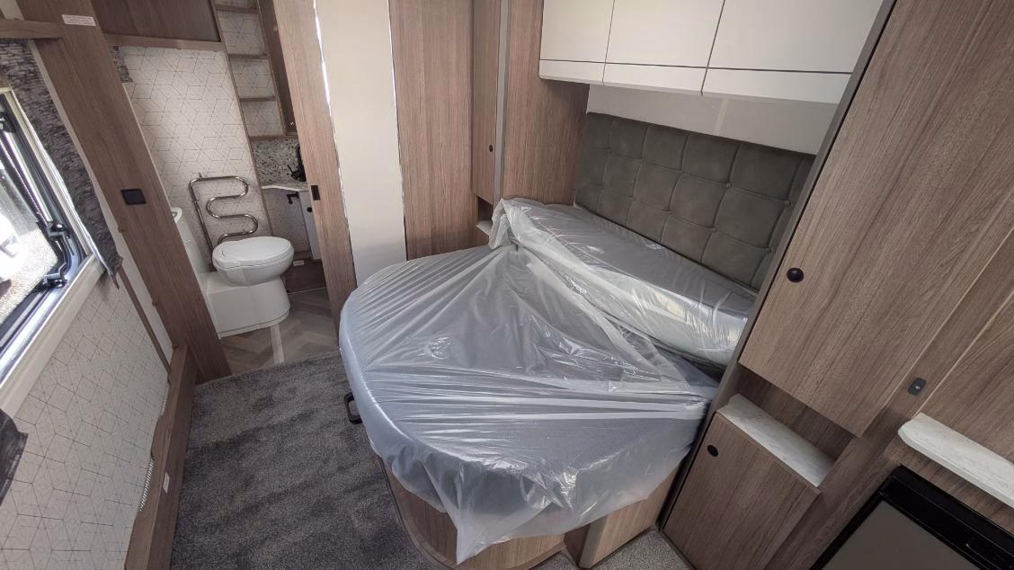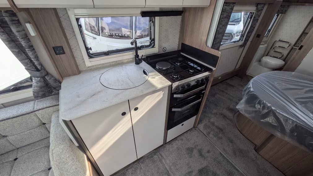 New for 2026, this model features stylish ‘Silver Grey’ smooth-side panels, updated exterior graphics, upgraded ‘Nebbia’ soft furnishings, and matt black kitchen handles, adding a modern touch to an already well-designed caravan.