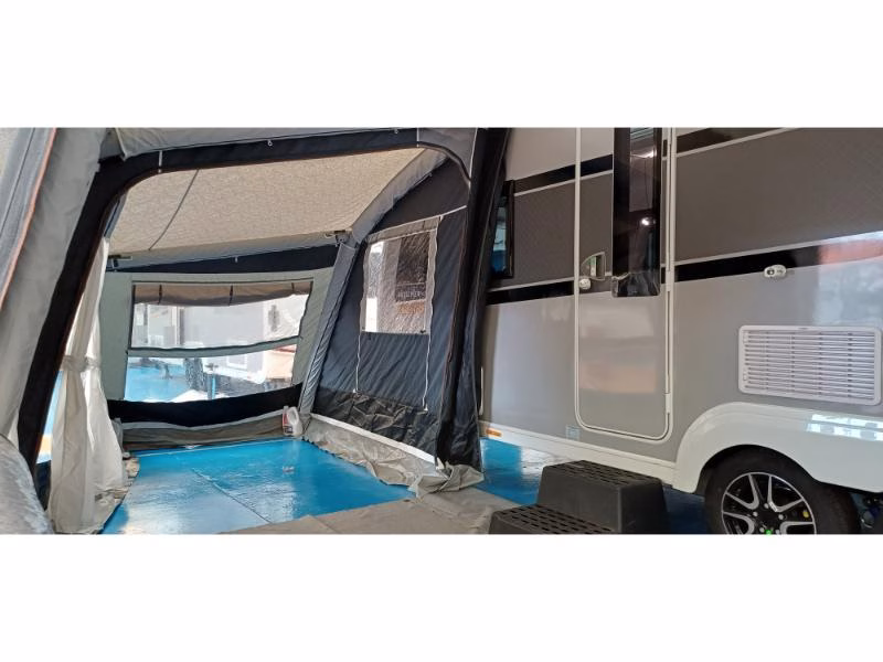 Front canopy (air beams), light panels in the roof, two large ventilation windows with mosquito nets at both ends, IsaAir system, Isacryl fabrics; extendable.